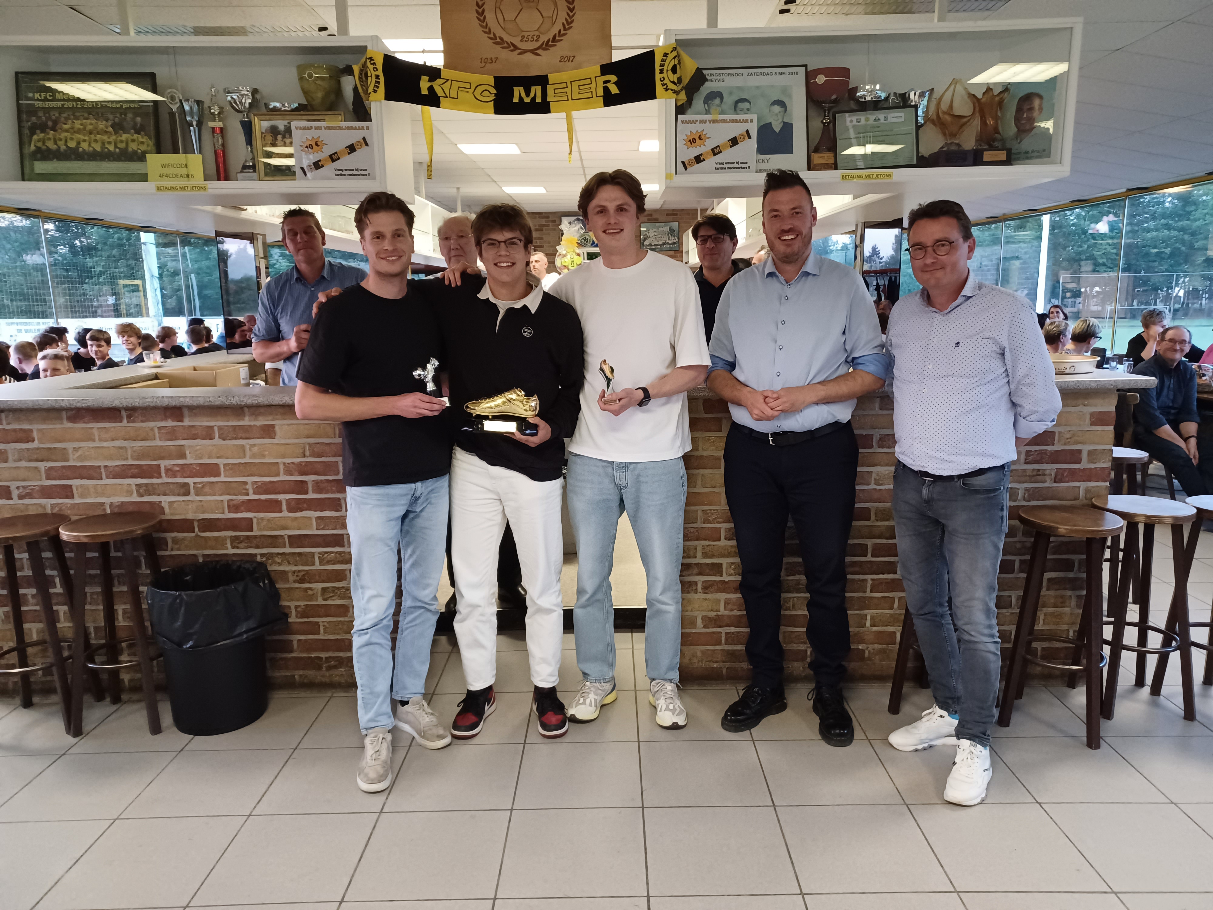 Zaterdag 25 mei werd wederom een memorabele dag in de clubgeschiedenis. Na een overheerlijke BBQ werd het tijd om onze vele vrijwilligers in de bloemetjes te zetten om hun tomeloze inzet. Nadien werden onze 3 kampioenenploegen onthaalt met een warm applaus en mochten al deze spelers ( 69 ) een aandenken in ontvangst nemen. Het lange wachten op de apotheose werd om 21u35 beloont met de uitreiking van de Gouden, Zilveren en Bronzen schoen. Cas Van Kessel werd al eerste naar voren geroepen en mocht de Bronzen schoen in ontvangst nemen, voor onze kapitein Cédric Van Den Bogerd was de Zilveren slof weggelegd terwijl de Gouden schoen dik verdiend naar Remy Goris ging waardoor hij met zijn 21 jaar wellicht de jongste gouden schoen is in de geschiedenis van K.F.C. Meer. ( ondertussen hebben we vernomen dat Pieter Voeten, Roel Hofmans, Glenn Verpoorten en wellicht ook Nick Jansen nog jonger waren toen zij de gouden schoen wonnen ). PROFICIAT aan alle laureaten.