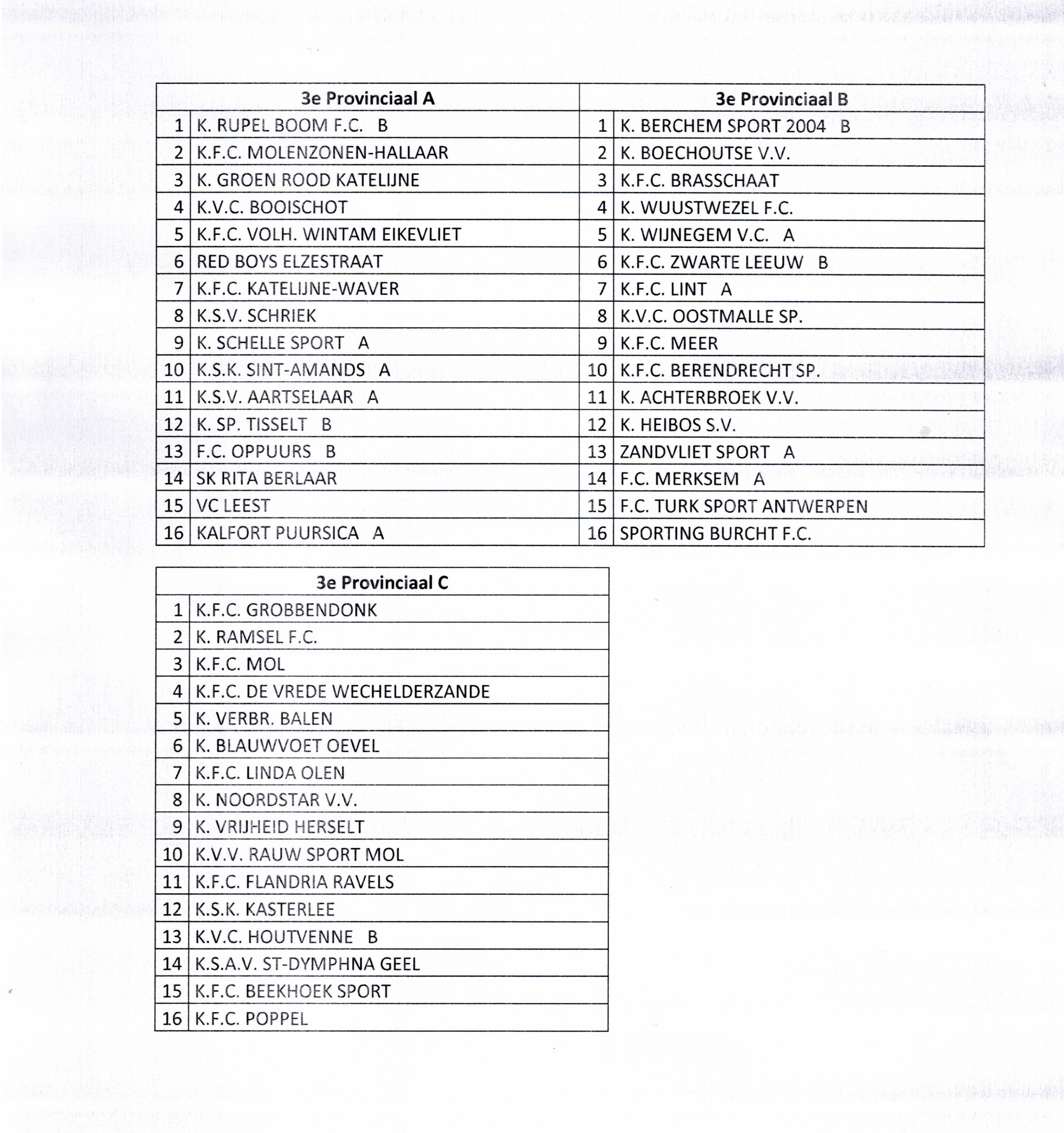 In de bovenste balk bij Heren 1e ploeg - 3e provinciale B vind je de tegenstanders van K.F.C. Meer voor het seizoen 2024 - 2025.